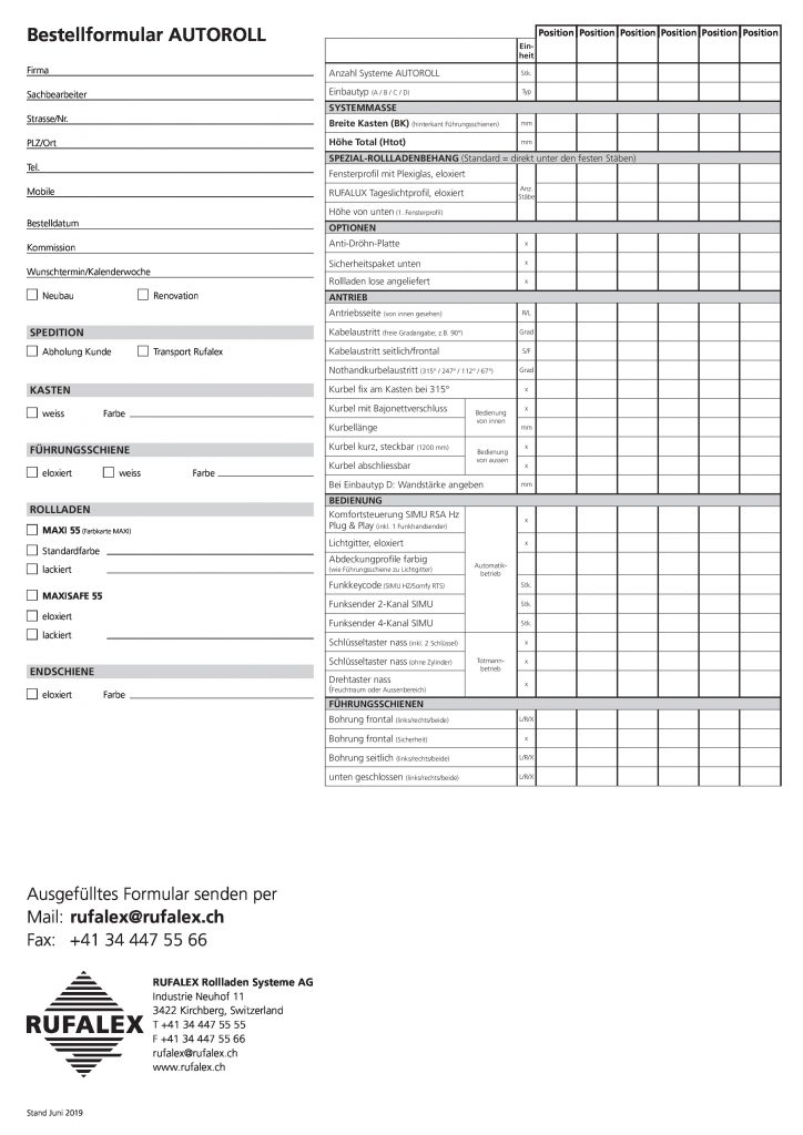 AUTOROLLBestellformular für Kastensysteme AUTOROLL.Download Bestellformular deutsch Fiche de commande françaisSystemRolltor-SystemeKastensystemeAUTOROLLRollladenMAXI 55®MAXISAFE 55®TechinfoBestellformulareRollltor-SystemeHersteller: RUFALEX Rollladen-Systeme AG