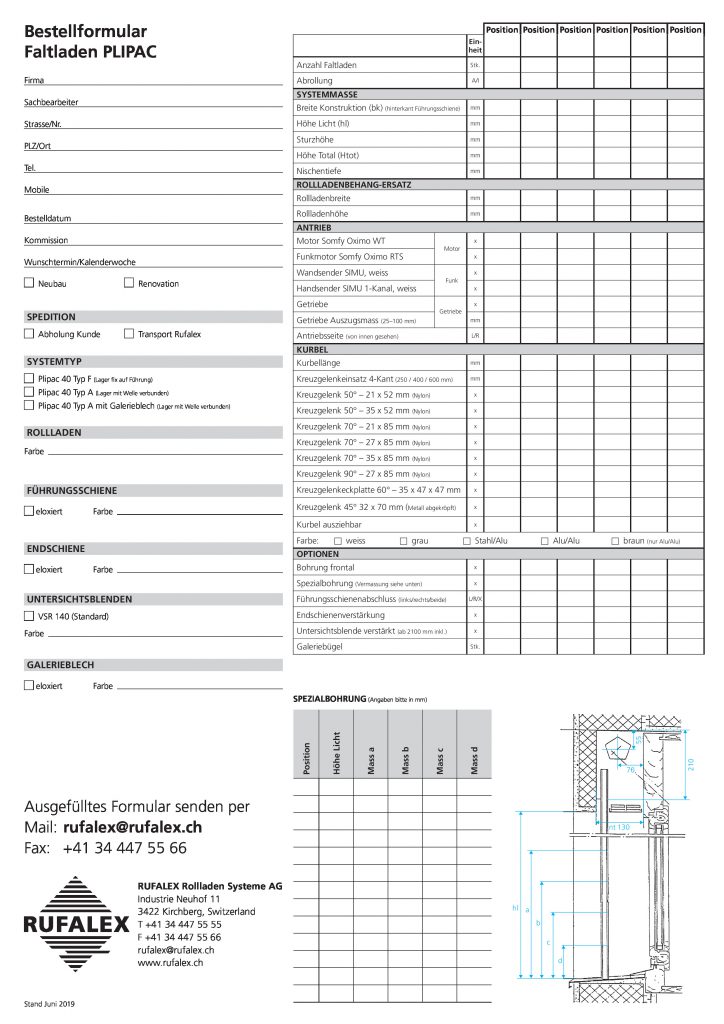 Archiviert - nicht mehr gültigFaltladen PLIPACBestellformular für Faltladen PLIPACDownload Bestellformular deutsch Fiche de commande françaisSystemRollladen-SystemeEinbausystemePLIPACTechinfoBestellformulareRollladenbehangHersteller: RUFALEX Rollladen-Systeme AG