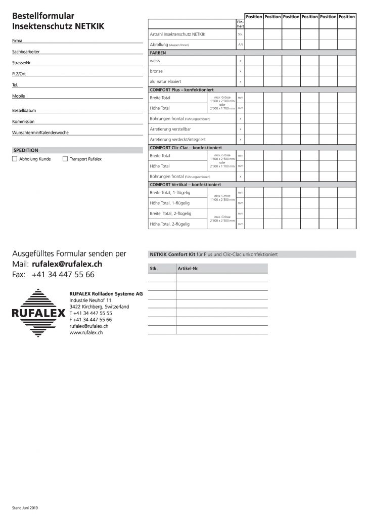 Insektenschutz NETKIKBestellformular für Insektenschutz von NETKIKDownload Bestellformular deutsch Fiche de commande françaisSystemInsektenschutzsystemefür Fensterfür TürenTechinfoBestellformulareInsektenschutzsystemeHersteller: RUFALEX Rollladen-Systeme AG