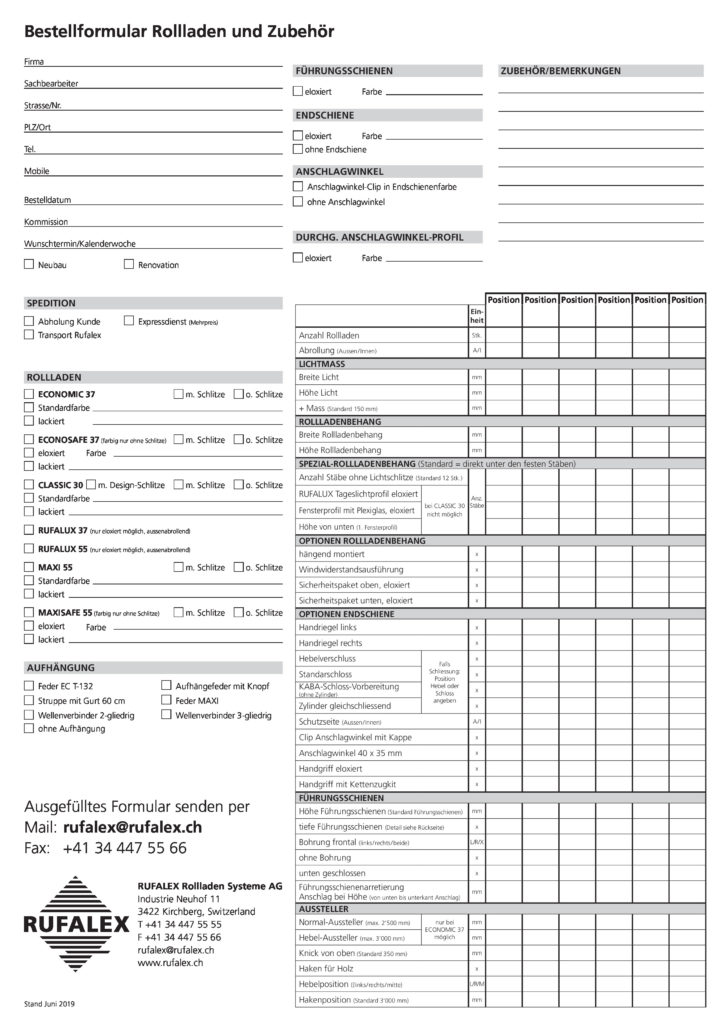 Rollladen und ZubehörBestellformular für Rollladen und ZubehörDownload Bestellformular deutsch Fiche de commande françaisRollladenCLASSIC 30®ECONOMIC 37®ECONOSAFE 37®MAXI 55®MAXISAFE 55®RUFALUX 55®TechinfoBestellformulareRollladenbehangZubehörHersteller: RUFALEX Rollladen-Systeme AG