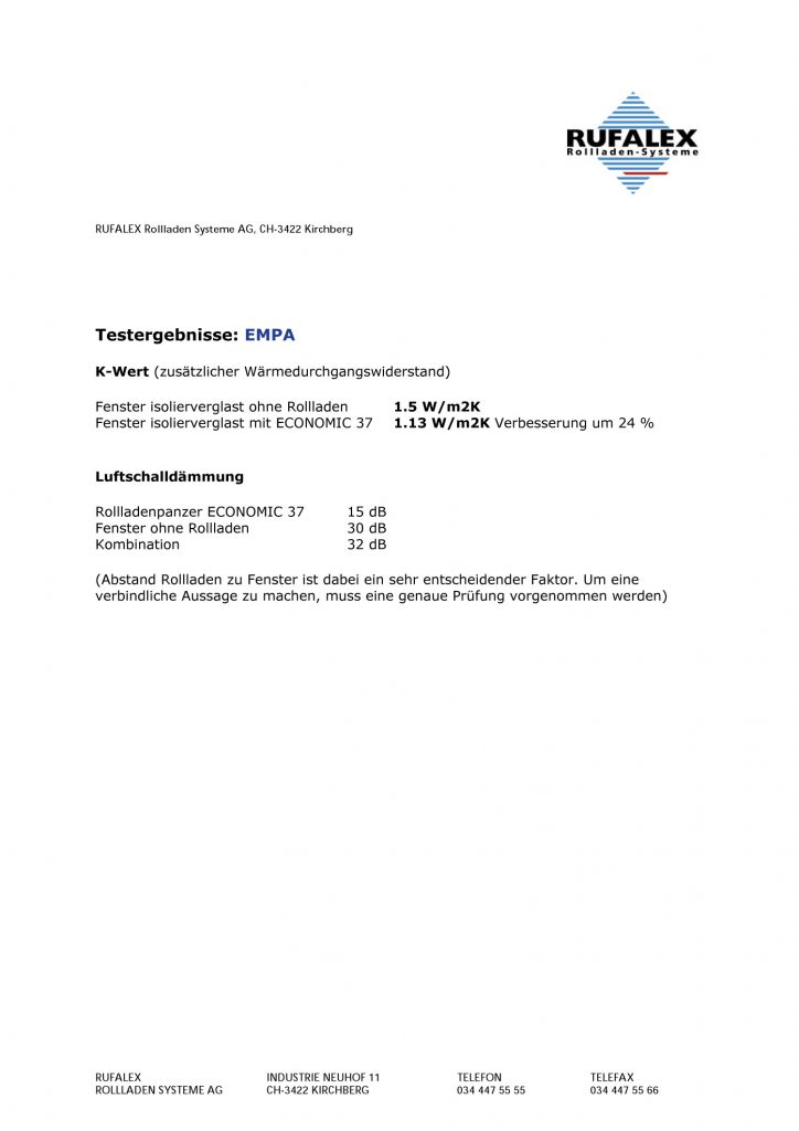 EMPAWärmewiderstandstest der EMPA Schweiz mit RUFALEX Rollladen des Typs ECONOMIC 37Download Testergebnisse EMPA (deutsch, PDF) Résultats de test EMPA (français, PDF)TechinfoNormenEnergy LabelHersteller: RUFALEX