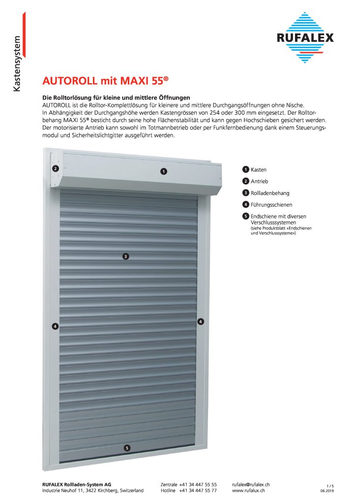AUTOROLL MAXI 55Technisches ProdukteblattDownload AUTOROLL mit MAXI55 AUTOROLL avec MAXI55SystemRolltor-SystemeKastensystemeAUTOROLLRollladenMAXI 55®TechinfoTechnische ProdukteblätterRolltor-SystemeKastensystemeHersteller: RUFALEX Rollladen-Systeme AGEingesetzt: 20130401