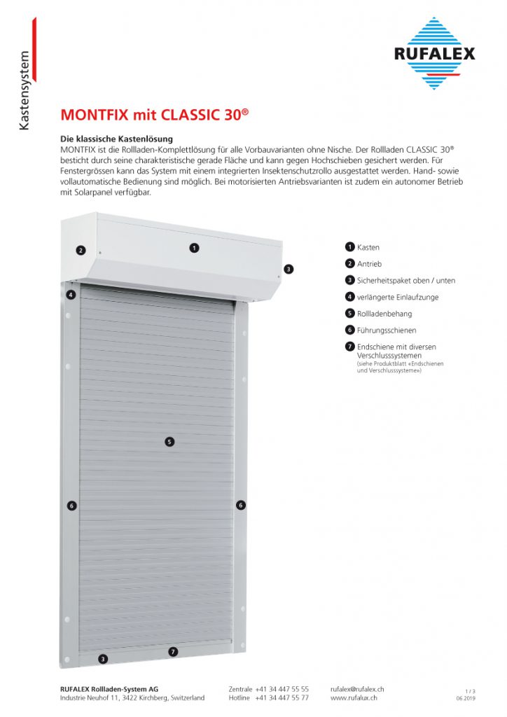 MONTFIX CLASSIC 30Technisches ProdukteblattDownload MONTFIX mit CLASSIC30 MONTFIX avec CLASSIC30SystemRollladen-SystemeKastenystemeMONTFIXRollladenCLASSIC 30®TechinfoTechnische ProdukteblätterRollladen-SystemeKastensystemeHersteller: RUFALEX Rollladen-Systeme AGEingesetzt: 20140901