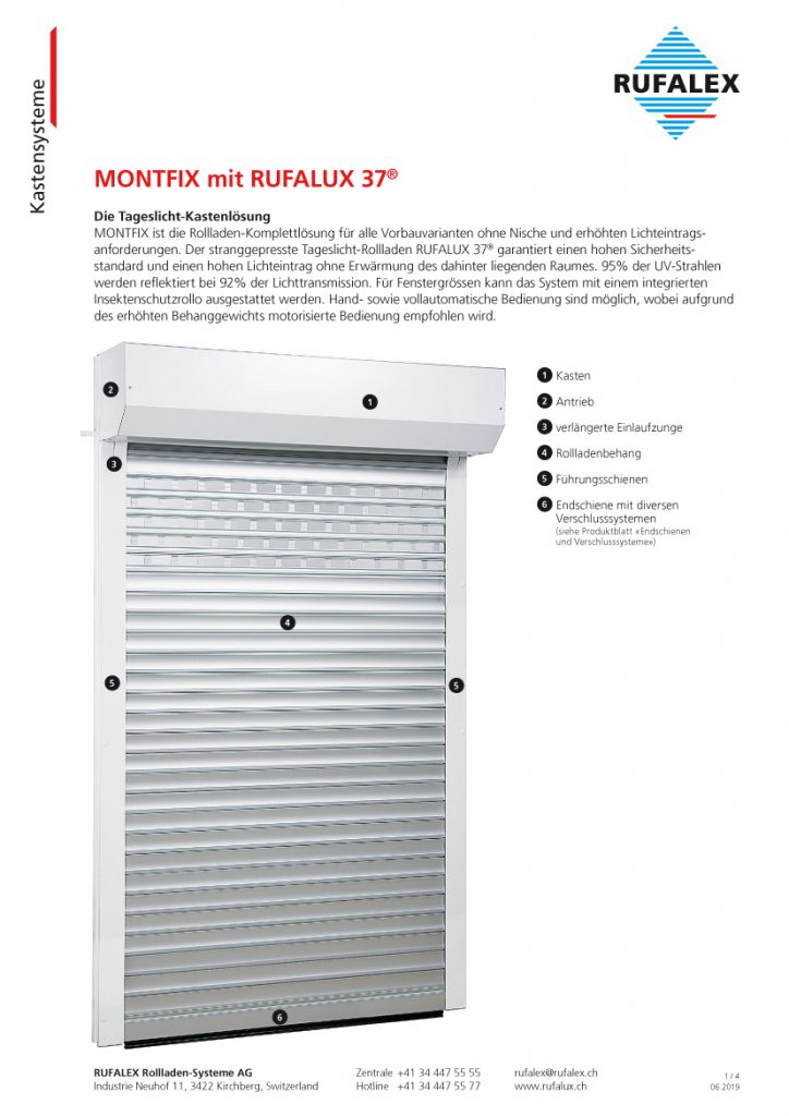 MONTFIX RUFALUX 37Technisches ProdukteblattDownload MONTFIX mit RUFALUX37 MONTFIX avec RUFALUX37SystemRollladen-SystemeKastenystemeMONTFIXRollladenRUFALUX 37®TechinfoTechnische ProdukteblätterRollladen-SystemeKastensystemeHersteller: RUFALEX Rollladen-Systeme AG