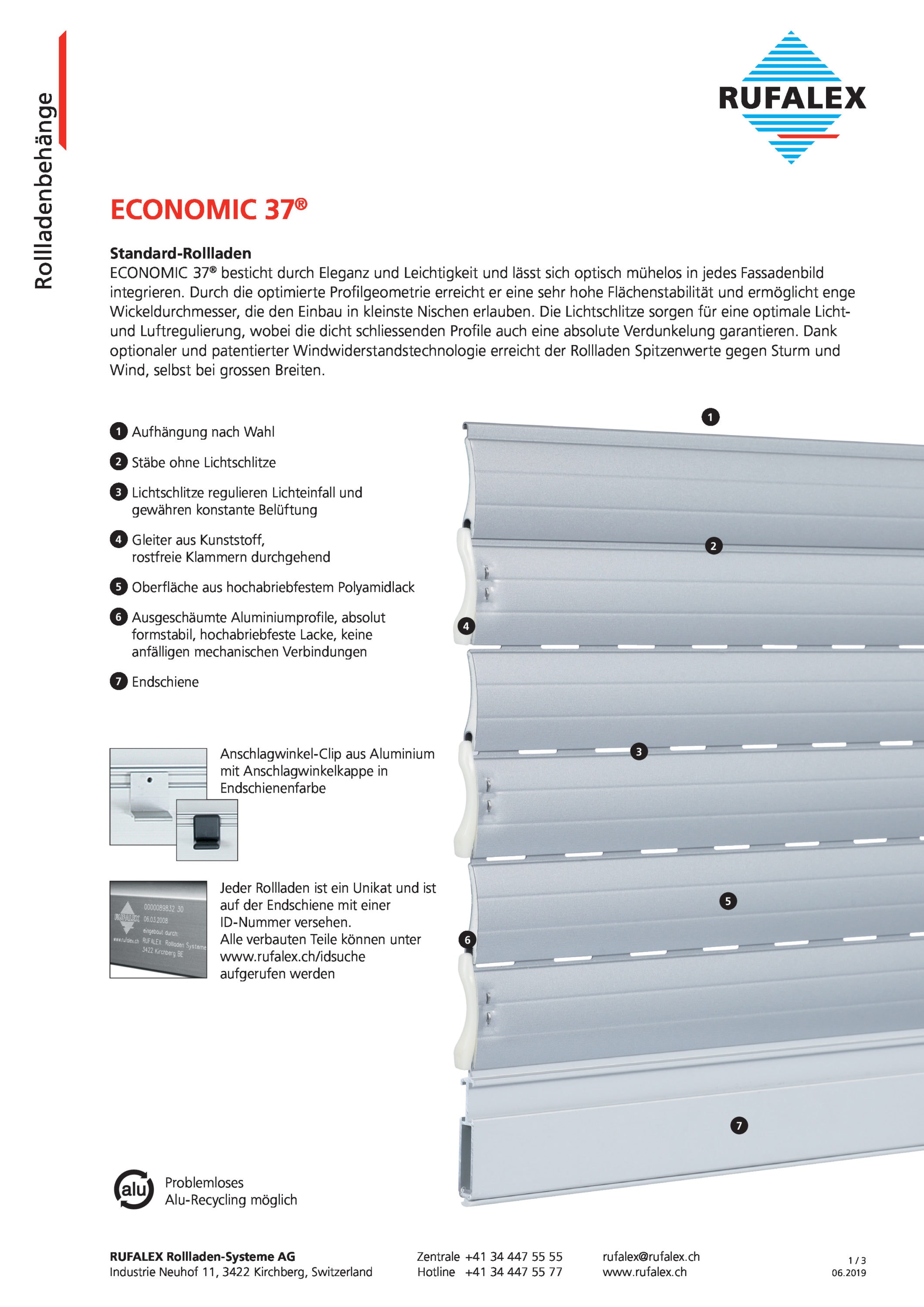 Rollladenbehang ECONOMIC 37Technisches ProdukteblattDownload Rollladenbehang Economic37 Tablier volets roulants Economic37SystemRollladen-SystemeEinbausystemeECOMONT 12+ECOMONT 12+ Profit-LineECOMONT 16+KastenystemeMONTFIXMONTFIX Profit-LineRollladenECONOMIC 37®TechinfoTechnische ProdukteblätterRollladenbehängeHersteller: RUFALEX Rollladen-Systeme AGEingesetzt: 20190603