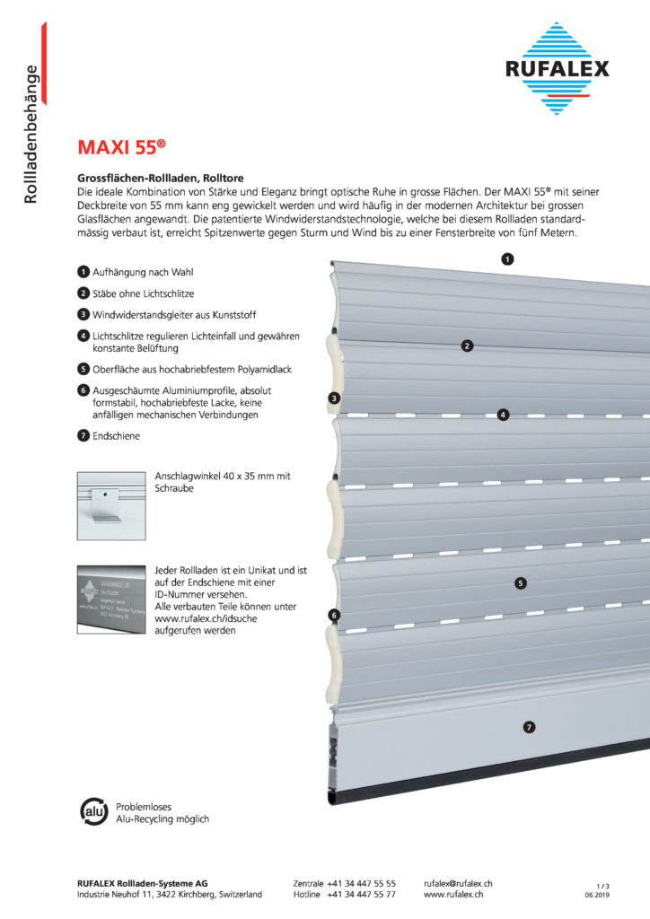 Rollladenbehang MAXI 55Technisches ProdukteblattDownload Rollladenbehang Maxi55 Tablier volets roulants Maxi55SystemRollladen-SystemeEinbausystemeECOMONT 18+Rolltor-SystemeEinbausystemeMAXIMONT SKastensystemeAUTOROLLMONTFIXRollladenMAXI 55®TechinfoTechnische ProdukteblätterRollladenbehängeHersteller: RUFALEX Rollladen-Systeme AGEingesetzt: 20190603