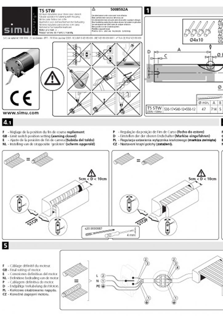 Motor mit progressiver Endlageneinstellung mittels am Motorenkopf befindlichen Reglierschrauben. Automatischer Verschluss des Storenkasten dank drehmomentreduziertem Verschluss im letzten Fahrbereich. Motorenrohrdurchmesser 45 mm. Bis 50 Nm Drehmoment. 230 Volt.