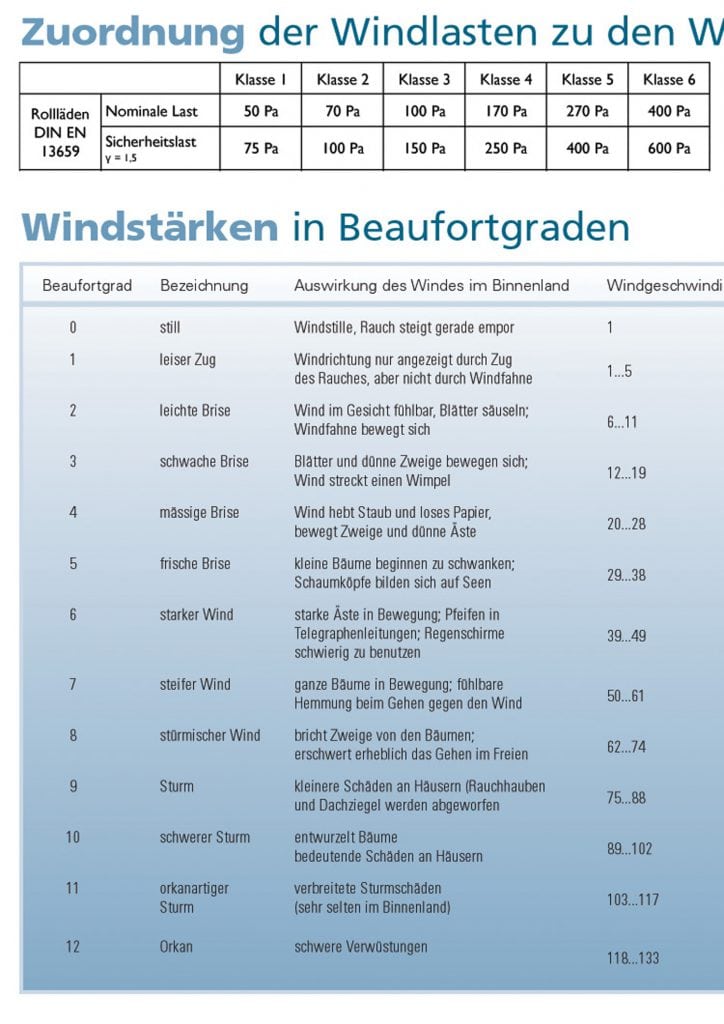 Zuordnung der Windlasten zu den Widerstandsgraden / Windstärken in Beaufortgraden