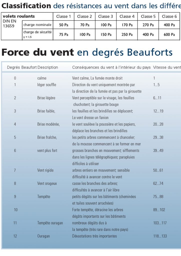 Classification des résistances au vent dans les différeb’ntes classes de réstistance/ Force du vent en degrés Beauforts