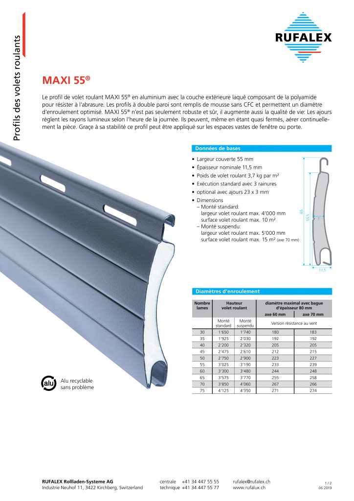 Profil de volet roulant MAXI 55Feuille de produitTélécharger Profils volets roulants Maxi55 Rollladenprofil Maxi55Systèmesystèmes de portessystème à caissonAUTOROLLMONTFIXsystèmes de montageMAXIMONT Ssystèmes de volets roulantssystèmes de montageECOMONT 18+Volet roulantMAXI 55®TechinfoFeuille de produitsprofil de volet roulantFabricant: RUFALEX Rollladen-Systeme AGUtilisé: 20190401