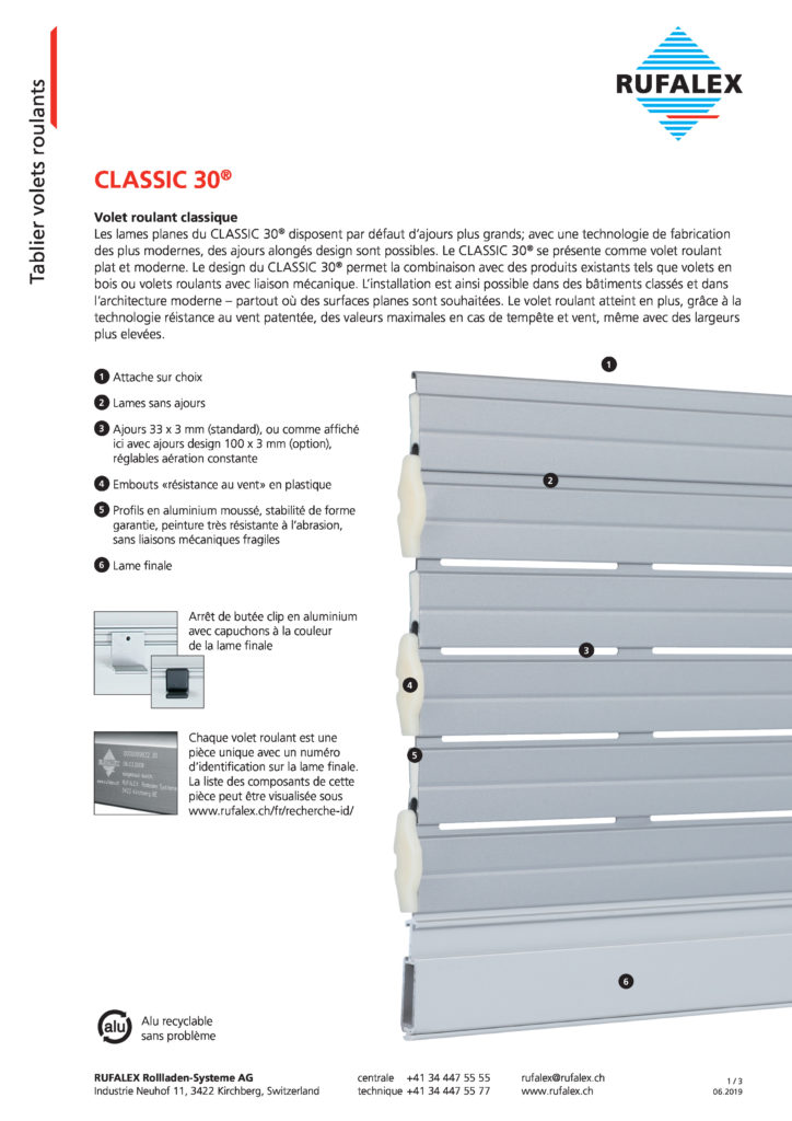 Tablier volet roulant CLASSIC 30Feuille de produitTélécharger Tablier volets roulants Classic30 Rollladenbehang Classic30Systèmesystèmes de volets roulantssystème à caissonMONTFIXsystèmes de montageECOMONT 16+Volet roulantCLASSIC 30®TechinfoFeuille de produitsvolets roulantsFabricant: RUFALEX Rollladen-Systeme AGUtilisé: 20190603