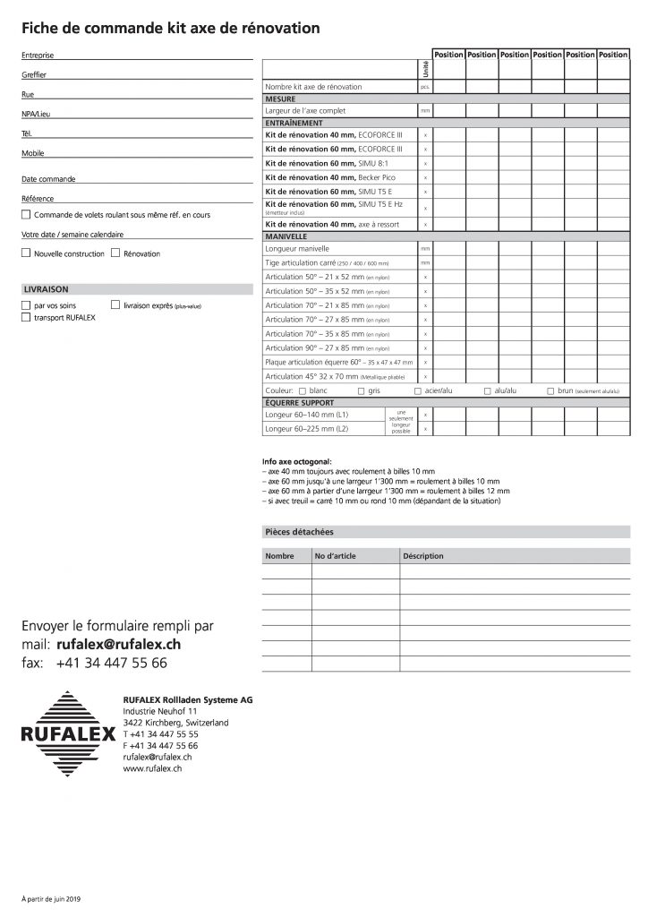 Kit axe de rénovationFiche de commande pour kit axe de rénovation.Télécharger Fiche de commande français Bestellformular deutschTechinfofiches de commandeAccessoiresFabricant: RUFALEX Rollladen-Systeme AG