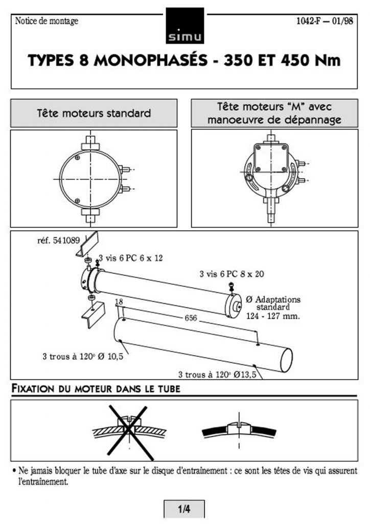 Moteur à réglage des fin de course progréssif par une vis de réglage, placé à la tête du moteur et système de dépannage du moteur intégré. Diamètre du tube du moteur, 97 mm. Couple jusqu’à 450 Nm. 450 Volt.